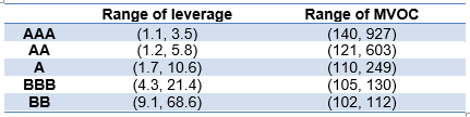 Exhibit 10: Ranges of leverage and MVOC overlap across rating categories