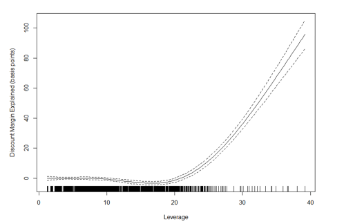 Using regression again to do the work, leverage explains 16% of the residual price variations across rating categories (Exhibit 2).  Moreover, the contribution of leverage to residual spreads rises sharply in ‘BBB’ and ‘BB’  classes (Exhibit 11).