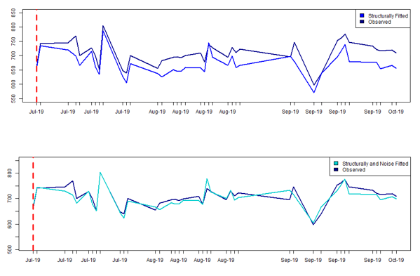 While quantifiable characteristics of CLOs explain a large part of security-to-security price differences, the relationships can change over time. Qualitative aspects of CLOs also are not directly measured in the model. Shifting relationships and unmeasured variables can lead to bias in predictions. Reducing this bias by averaging recent errors and correcting them helps improve accuracy. The final estimates after adjusting for the average difference between observed and fitted spreads in a 30-day rolling window are much closer to the observed spreads (Exhibit 12).