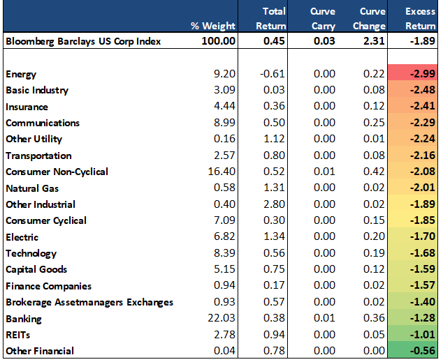 Not surprisingly, the hardest hit sectors within the Index included Energy & Basic Materials, as well as Insurance credits, which are most directly impacted by ~15% sell-off in equities over the same period. Also rounding out bottom performers were sectors with the longest duration concentrations, such as Transports and Communications. The Finance sector has demonstrated the most resistance to selling pressures, particularly as lower rates are perceived positively for segments, such as REITs, and increased market volatility should serve as a boost to Brokers/Exchanges (Exhibit 1).