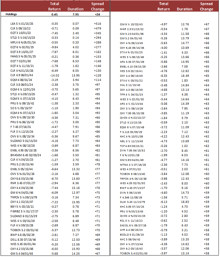 Kraft Heinz Company (KHC – Baa3/BB+(n)/BB+): KHC’s negative 4.99% excess return performance follows 4Q results that missed sales estimates and two subsequent downgrades to junk. With two out of three ratings now in HY territory, KHC will be moved out of the IG index at month end. KHC’s large debt balance (over $29.9 billion at year end) could have a hard time finding its footing in the HY market, which could put further pressure on spreads despite the move wider already. KHC has indicated that its turnaround will take time and will only announce its strategic plans in May 2020, despite previous guidance of early 2020. Additionally, KHC’s leverage remains high at 4.4x and is likely to remain above the 4.0x level through fiscal 2021, unless the company is able to execute asset sales (underscoring S&P’s negative outlook). While KHC had previously been looking to sell certain brands including Ore-Ida, Breakstone and Maxwell House, those sales never came to fruition. KHC’s accounting issues last year, while immaterial, may lead potential buyers to drag out due diligence. Furthermore, the SEC investigation into the accounting and procurement issues has yet to be resolved.