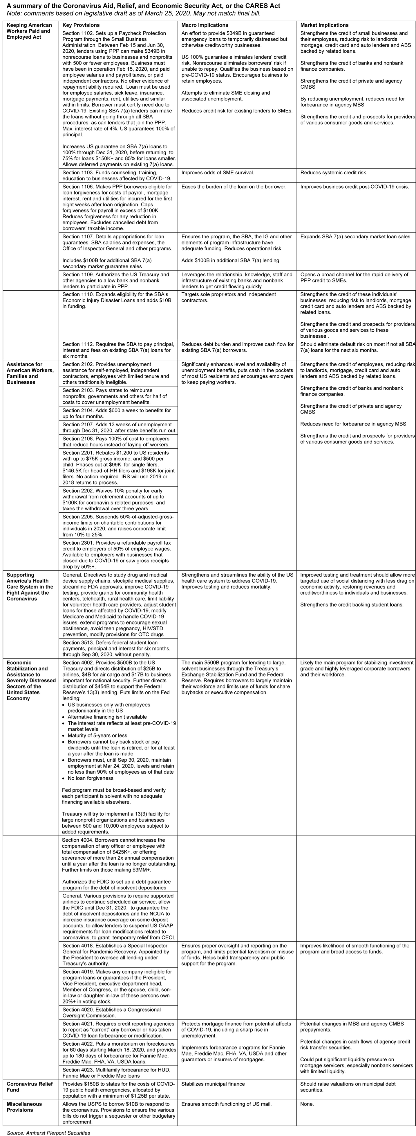 - Assistance for American Workers, Families and Businesses. Enhances unemployment benefits, expands eligibility, provides direct payments to most US residents, temporarily drops penalties on IRA withdrawals, encourages charity and provides an employer payroll tax credit. This directly supports households and unemployed workers. It should strengthen the fundamental credit of securities backed by consumer cash flows, including mortgage securities, auto and credit card ABS, student loans and others.