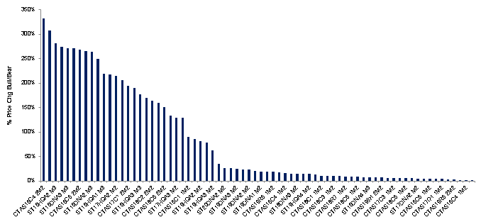 The pricing in base, bullish and bearish scenarios helps produce a pair of important measures: the percentage price gain in the bullish case, and the percentage price loss in the bearish case. For example, the price of a CRT might rise by 3% in the bullish case and drop by 1% in the bearish case. That security would have an upside-to-downside ratio of 3-to-1, or 300%. That would look more attractive than a second security that might have 2% upside and 1% downside, or a ratio of 200%.