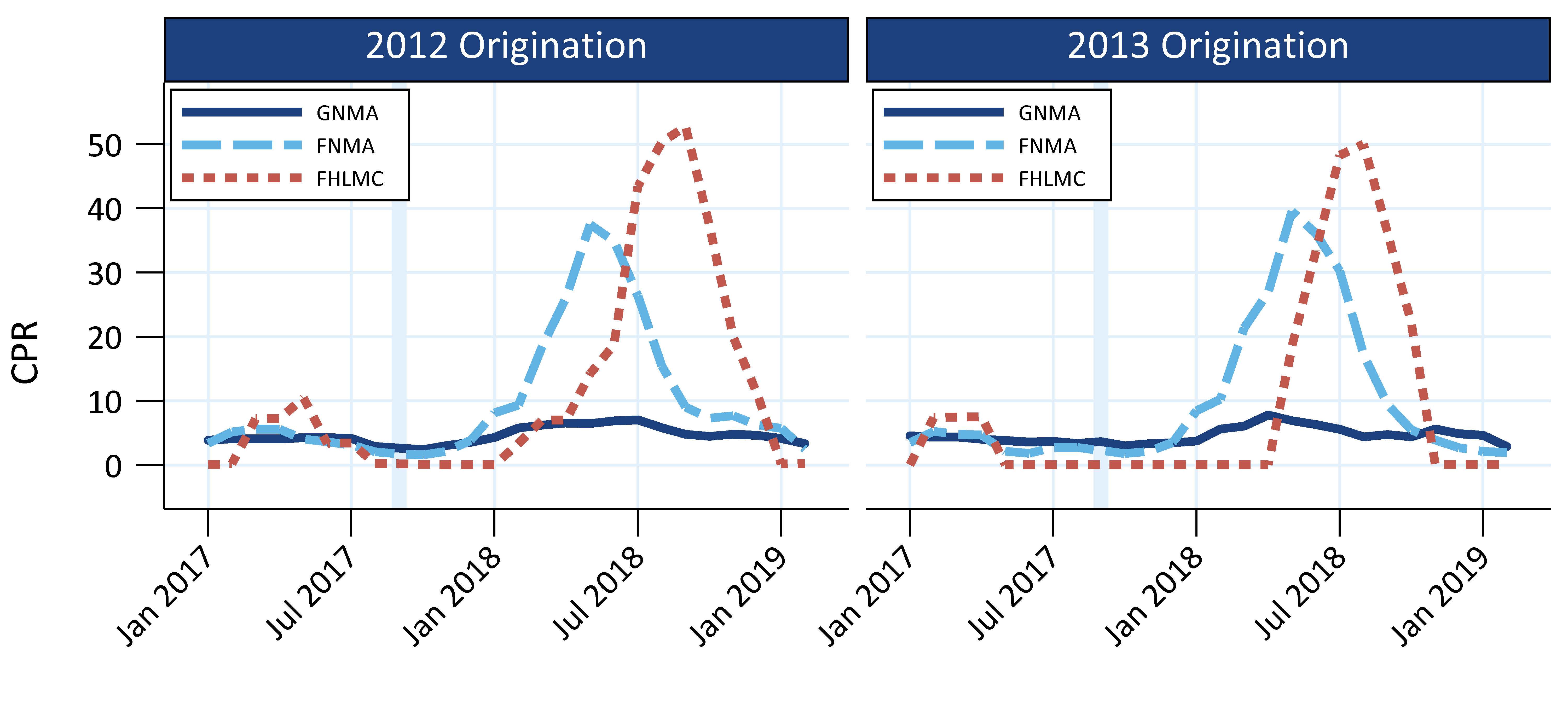Prepayment speeds in Puerto Rico following Hurricane Maria illustrate the difference between the GSEs and Ginnie Mae (Exhibit 1). Ginnie Mae speeds on these loans remained very slow, showing a very small uptick in buyouts in early 2018. GSE speeds, however, spiked as high as 50 CPR when loans exited their 6-month forbearance plans and could not be cured. Note that most Ginnie Mae Puerto Rico loans are FHA, so the slow speeds are very likely a result of the FHA partial claim program.