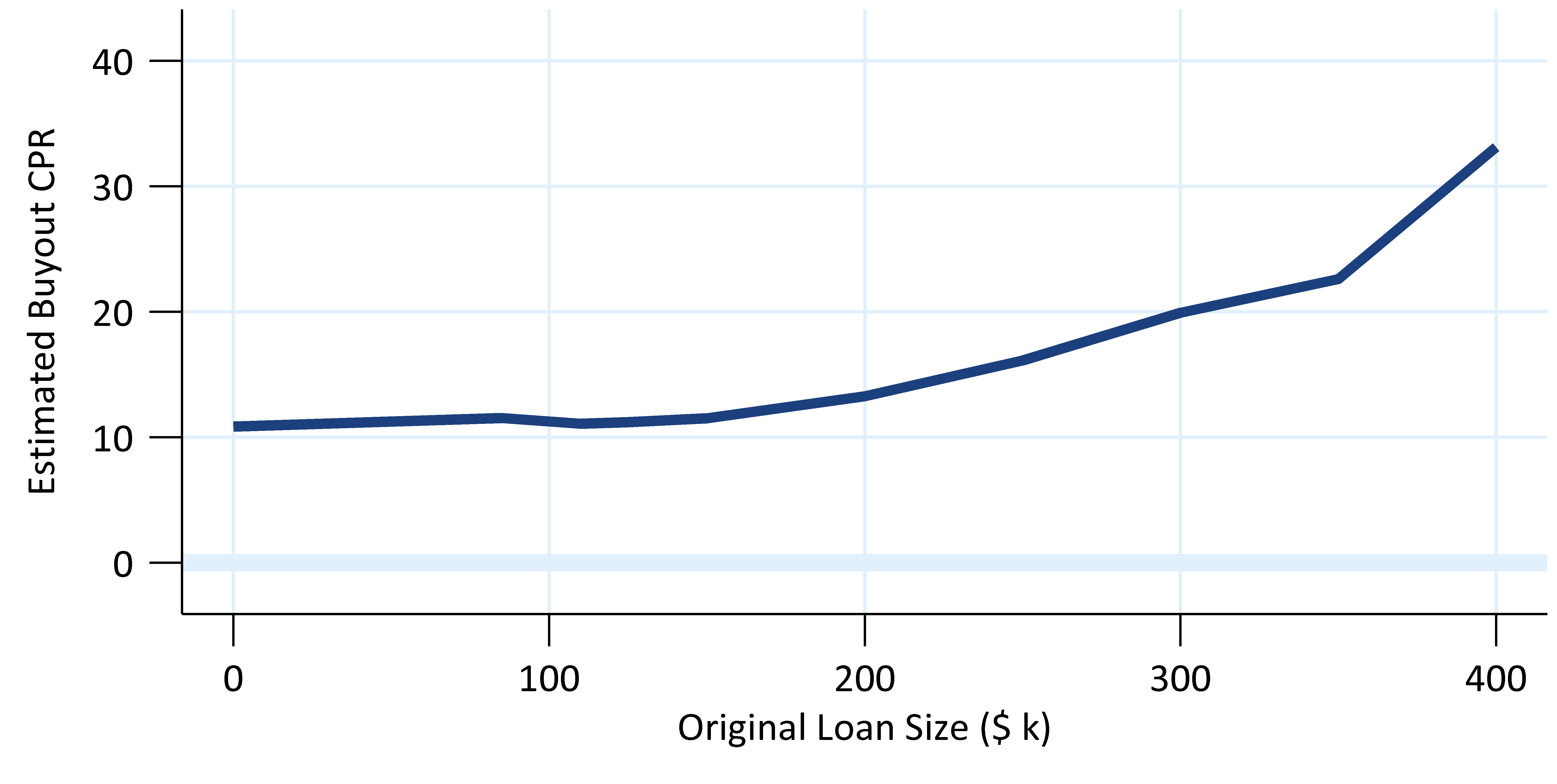 Loans with higher balances showed much larger month-over-month prepayment speed increases than lower balance loans (Exhibit 2). At the time most Freddie Mac loans were below the $417,000 conforming limit. While loans in the LLB/MLB range had an estimated 10 CPR buyout rate, loans near the conforming limit had a 30 CPR buyout rate. This implies higher balance loans defaulted roughly 3× faster than the lower balance loans over the prior two years.