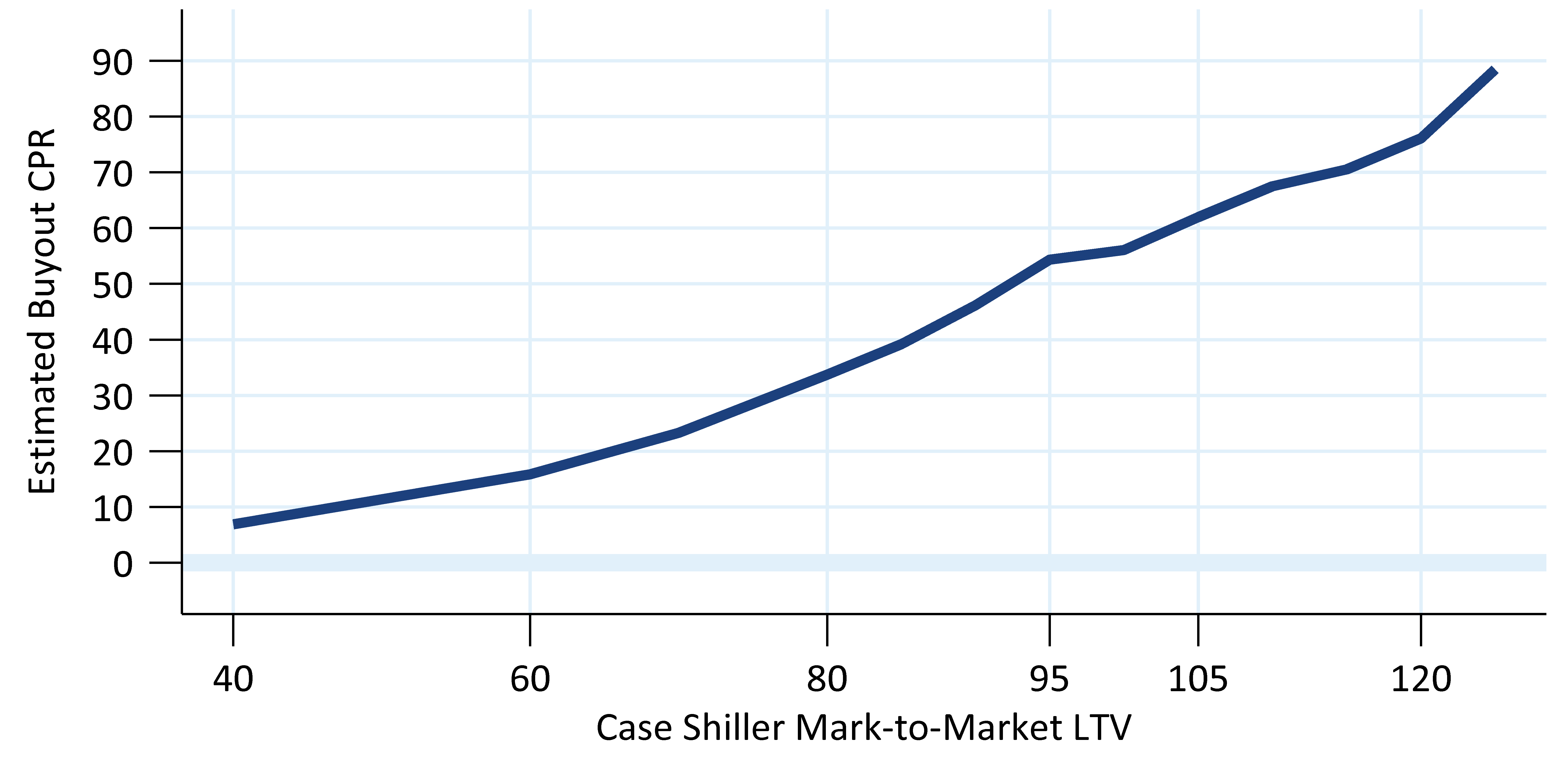 High LTV pools are likely to have higher delinquency rates and flatter S-curves, but are more likely to have faster buyout rates as forbearance ends (Exhibit 3). High LTV borrowers, especially those with initial LTVs above 95, generally stretched to buy their homes and have fewer assets to rely on to make payments. And borrowers with little equity are more likely to walk away from the home altogether. So these loans may experience lower cure rates than others. Loans between 95 and 105 mark-to-market LTV (estimated using Case Shiller’s home price index) prepaid roughly 45 CPR faster than a 60 LTV loan due to buyouts.