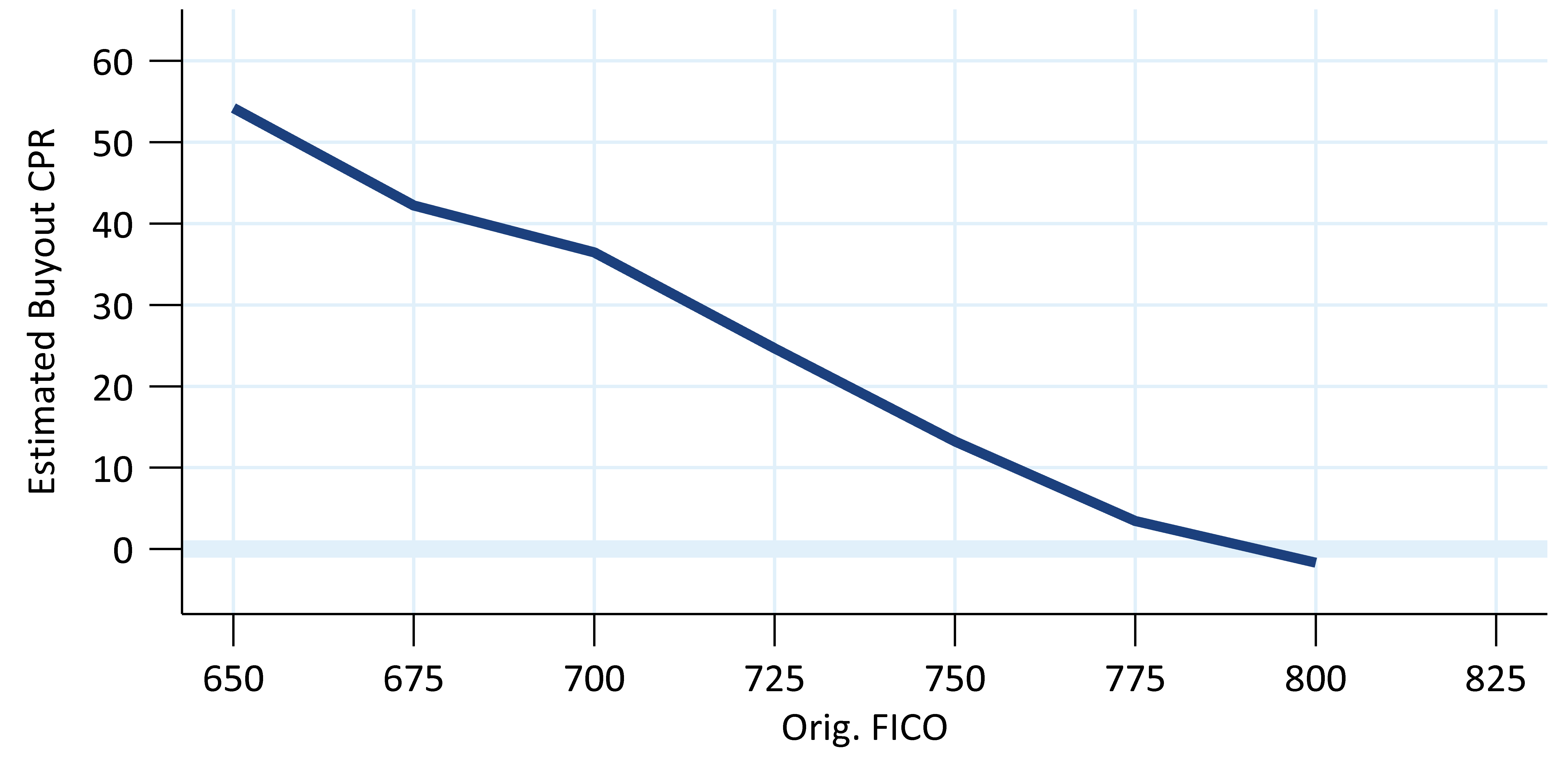 Low FICO loans defaulted faster than high FICO loans during the 2008 financial crisis, while the best credit borrowers had very low buyout rates (Exhibit 4). The typical low FICO borrower in current GSE pools is roughly 675 FICO, which prepaid about 40 CPR faster than a 750 FICO borrower due to buyouts. Therefore S-curves should flatten significantly on these pools. This also implies that FICO pools should see slightly lower delinquency rates than high LTV pools. However, low FICO pools will likely exhibit a better cure rate than high LTV pools since low FICO pools usually have lower LTVs.