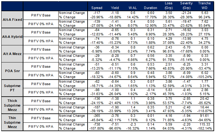 Looking at both nominal and percentage differences on a handful of legacy profiles with and without COVID-19 overlays across base case and zero HPA scenarios, increases in cumulative losses are relatively modest across Alt-A, Option ARM and subprime profiles due to a decline in payment velocity appear relatively modest. However, depending on capital structure leverage, the impact can be outsized. One somewhat counterintuitive result is seeing negative percentage tranche write downs on Option ARM seniors and subprime mezzanine bonds. This is a function of the bonds forecasting negative losses, or writing up in the base case scenarios versus taking losses in the COVID-19 scenarios as a function of increased defaults and losses as well as a reduction in excess spread due to increased incidence of modifications.