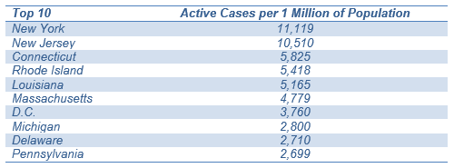 Active cases. With the exceptions of Louisiana and Michigan, which reflect the hot spots in New Orleans and Detroit, the 10 states with the highest incidence of COVID-19 lay entirely along the Acela Corridor from D.C. to Boston (Exhibit 1). Only Maryland along that path escaped the Top 10, and just barely, ranked 12 and rising fast.