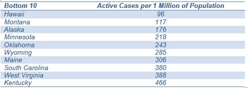 Exhibit 2: Bottom 10 states for active cases relative to population
