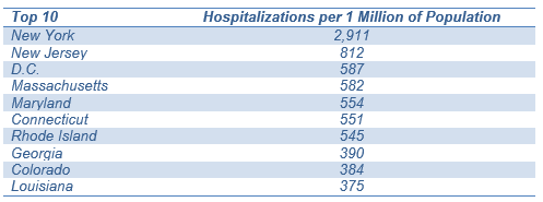 In the Bottom 10 for hospitalization rates, again there is a heavy representation for more rural states (Exhibit 4). Several states in the Midwest made the list. Texas is a noteworthy entrant, as a large state and one that is poised to ease its lockdown restrictions. Take note of #8. After being one of the first hot spots when the virus began to spread in the U.S., Washington was able to tamp down the virus effectively and is now in good shape.