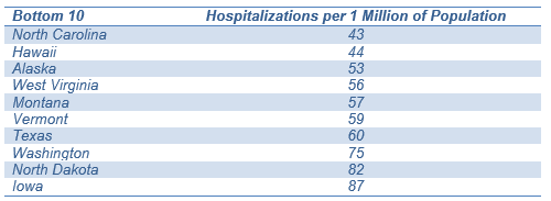 Exhibit 4: Bottom 10 states for hospitalizations relative to population