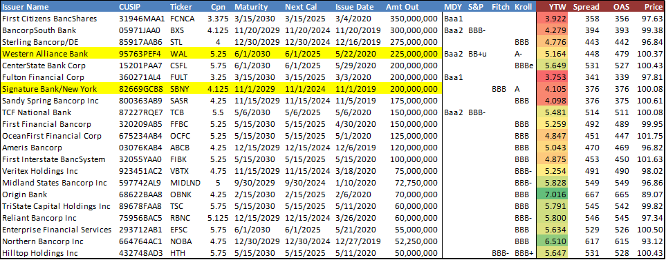 NYCB was among the top performers in the IG Index in 2019. Obviously, it was hit hard in the sell-off, but we see very good value in current risk compensation considering the bank has over $50 billion in assets and the deal is index-eligible. NYCB should trade closer in-line with large, IG-rated regional comps, such as SOV, CFG, SNV, PBCT, BKU, etc on a yield basis. Although the callable structure is akin to the USD private bank market that is mostly dominated by smaller regional and community banks, the NYCB deal maintains two IG ratings and $300 million outstanding, placing it closer to the IG-rated universe of large BBB regional banks (see below). NYCB’s closest peer Signature Bank NY (SBNY: Subordinated Ratings: Fitch – BBB, Kroll – A) came market with a non-index 10NC5 sub note at 4.125% coupon in late October; those bonds are now yielding ~4.175% to call.