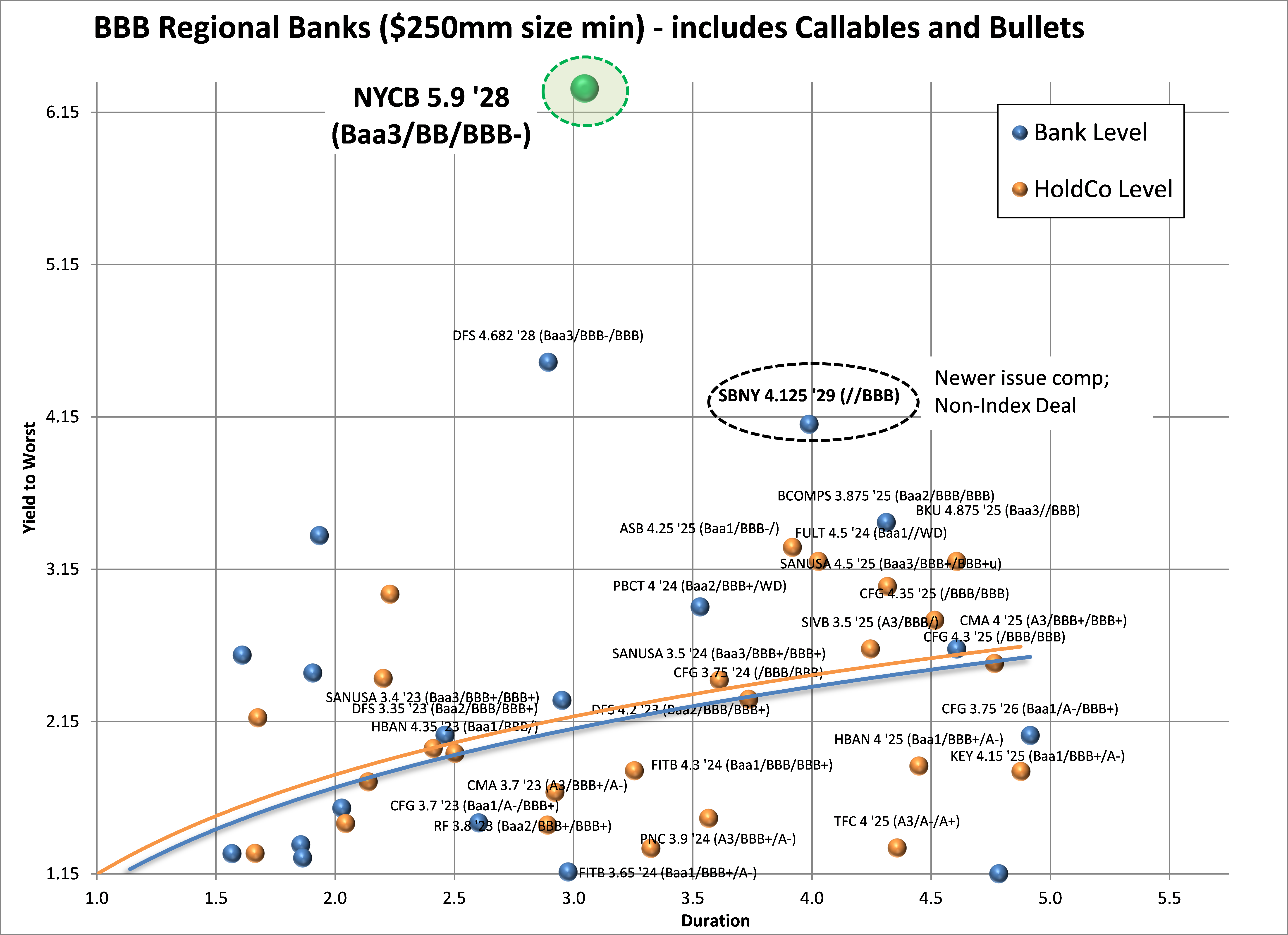 Exhibit 3. Intermediate BBB Regional Bank Paper: Yield vs Duration – contains bullet and callable structures