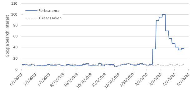 Search interest in forbearance rose sharply after the middle of March, which coincided with the beginning of COVID lockdowns in many states and the resulting spike in new unemployment claims. Forbearance was a central topic as Congress deliberated and passed the CARES Act. Search activity peaked for the week ending April 8 and declined roughly 60% by the middle of May. However, this level is still about five times higher than the interest one year earlier.