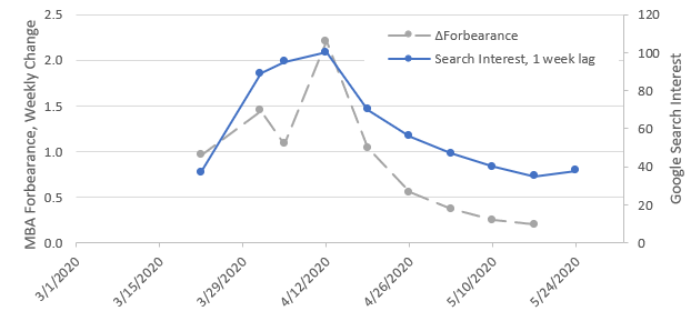 Exhibit 2: Google searches for “forbearance” appear to correlate with changes in the MBA’s forbearance survey the following week.