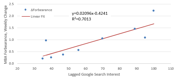 The data tracks nicely against the MBA reports (Exhibit 2). First, since the MBA only reported monthly until April, the analysis assumes that all the growth in forbearance came in the second half of the month. Second, the exhibit compares the MBA’s survey to the search interest reported one week earlier. This lag significantly improves the correlation