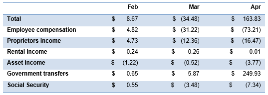 In April, despite a $73 billion loss in employee compensation, government transfers of nearly $250 billion helped push US personal income to a nearly $164 billion gain (Exhibit 2). More than 85% of that transfer came from $1,200 checks sent to eligible taxpayers. Another 12% came from unemployment benefits, with a substantial lift from CARES Act federal unemployment benefit of $600 a week. A small amount of unemployment benefits also went to sole proprietors, consultants and others not usually eligible. The CARES Act also extended unemployment benefits for 13 weeks for individuals who have exhausted state benefits, which resulted in a small transfer in April.