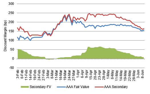 Note: Fair value estimated by a model based on rating, CLO structure, loan portfolio attributes, manager and general market conditions. A description is here. AAA secondary spreads estimated based on model estimate and the rolling 30-day difference between model estimates and publicly reported secondary market trades. Source: Amherst Pierpont Securities