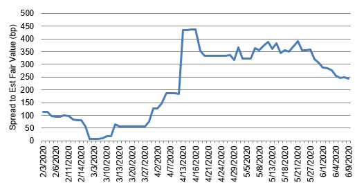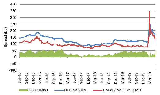 CLO ‘AAA’ debt still has good prospects for seeing tighter spreads. CLOs should get some lift from relative value investors, but the bigger lift should come from the broad prospects for higher quality risk assets. With the Fed’s commitment at the June FOMC to buy at least $80 billion a month in Treasury debt, $40 billion a month in MBS and maintain its pace in agency CMBS, the supply of the highest quality assets should continue to shrink. More investors should get squeezed into the highest quality CMBS, ABS and CLOs.