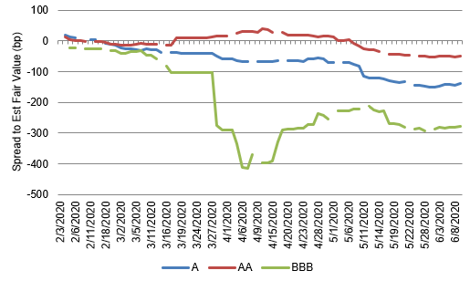Mezzanine investment grade CLO paper looks rich to fair value. ‘AA’ paper over the last 30 days has averaged nearly 50 bp tight to fair value, ‘A’ paper has averaged nearly 140 bp tight and ‘BBB’ paper has averaged nearly 280 bp tight (Exhibit 3).