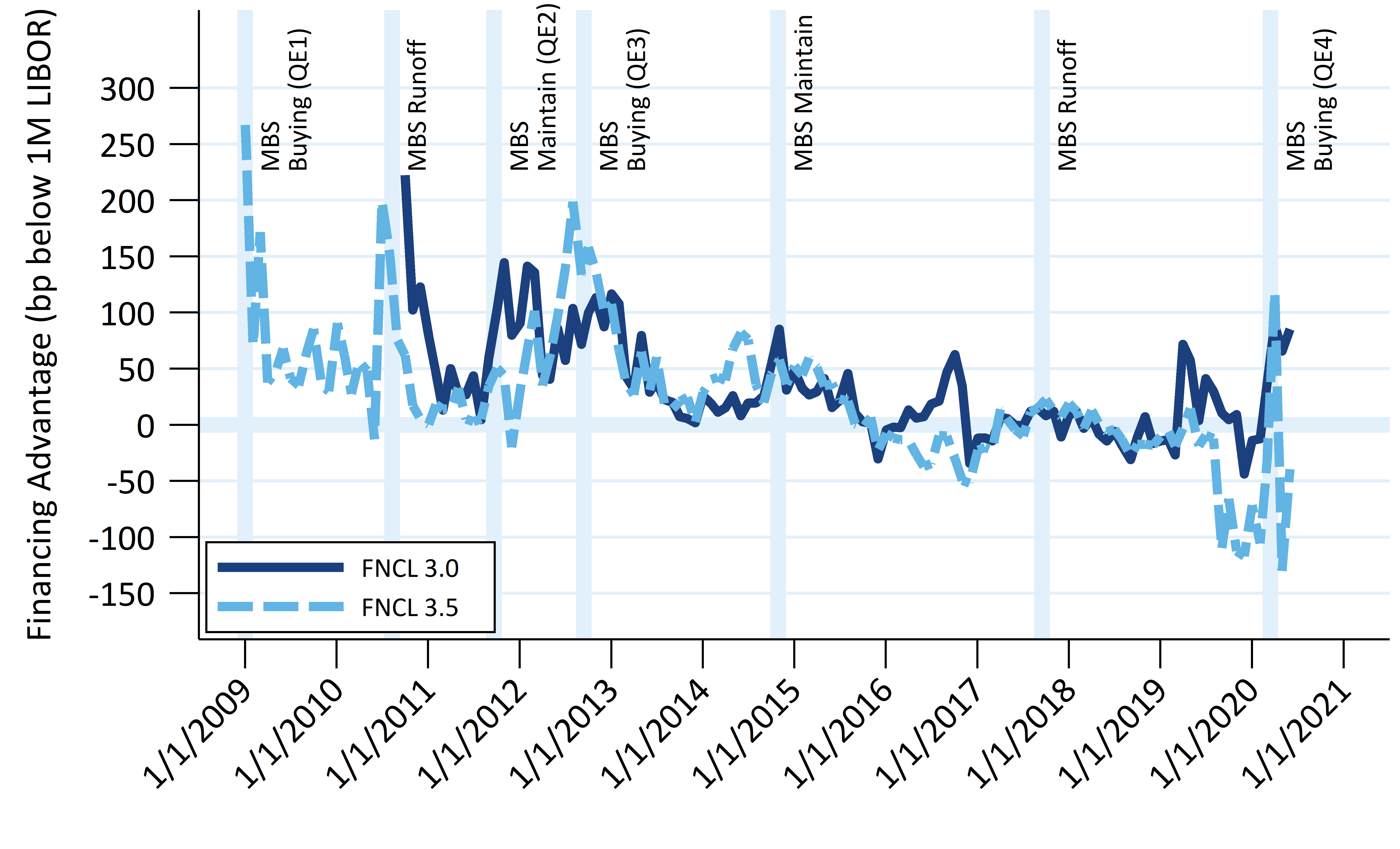 Finally, in late 2017 the Fed permitted the MBS portfolio to shrink as MBS pools paid down. During this time, which lasted until the pandemic, roll financing was often at rates slightly higher than LIBOR. During 2019 overnight repo rates for MBS were generally slightly higher than one-month LIBOR, and monthly MBS funding rates were even higher than overnight rates. This was reflected in the dollar roll as well.