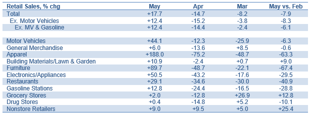Auto dealers fall in between the two extremes. Relative to expectations, auto sales have held up much better than feared back in March and April. The May retail sales tally for motor vehicle dealers was only 6% below the February level, though unit sales still have much further to go, down by more than 25% from February with part of that gap reflecting a collapse in fleet sales mainly by rental car companies.