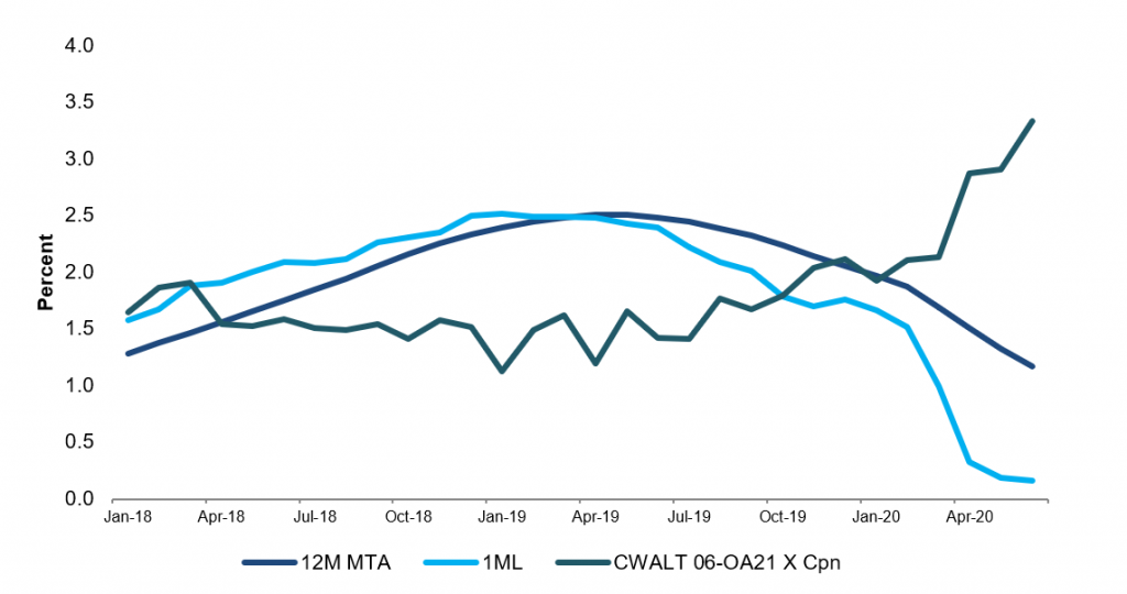 One example of an MTA basis IO is CWALT 2006-OA21 X. The X class is stripped off of the entire collateral balance. The bond’s coupon is derived from the difference between the collateral net WAC and coupons of the senior and subordinate bonds. The IO gets paid at the top of the interest payment waterfall, where, absent the need to repay interest shortfalls, its coupon will be paid pro-rata with the senior certificates. The senior and subordinate bonds in the deal are structured as 1-month LIBOR floaters. Therefore, as LIBOR decreases and MTA lags, the basis IO coupon will increase.