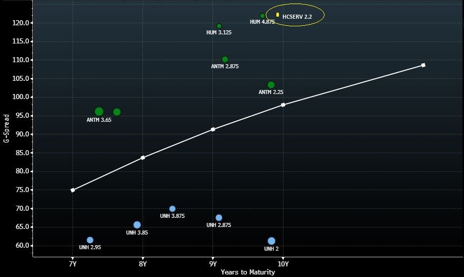 Investors looking for additional yield in the relatively stable HMO sector should consider the Health Care Service Corporation (HCSERV) credit. HCSERV provides for not only a pick-up in g-spread from Humana (HUM – Baa3/BBB+/BBB) but a jump up in ratings category as its senior unsecured bonds are rated A3/A+/A-. With HCSERV, investors can move into a credit that is both lower levered and has a much stronger RBC ratio.