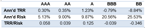 Overall, ‘A’ debt returned an annualized 1.23% through July with an annualized standard deviation of 9.87%, or a return of 12.5 bp for each 1% of risk (Exhibit 2). ‘AAA’ debt returned an annualized 0.30% with an annualized volatility of 5.13%, and ‘AA’ debt returned 0.35% with a volatility of 9.00%. ‘BBB’ and ‘BB’ debt showed negative returns of -0.79% and -8.84%, respectively, with annualized risk higher than 20%. The risk-adjusted return for ‘A’ debt leads the other debt classes.