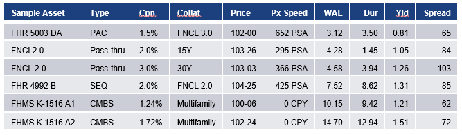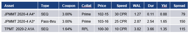 Note: *Traditionally quoted as a price concession to TBA pass-throughs. JPMMT 2020-4 A3 traded $2-04 back of TBA with FNCL 3s (Aug) at 105-20 on 7/29/30. JPMMT 2020-5 A3 came to market 7/1/20 at $2-16 back of FNCI 3s (Aug). Estimate on 7/29 at 2-14 back with FNCI 3s (Aug) at 104-29. Speed, WAL, duration and yield estimated from Bloomberg. Source: Amherst Pierpont Securities