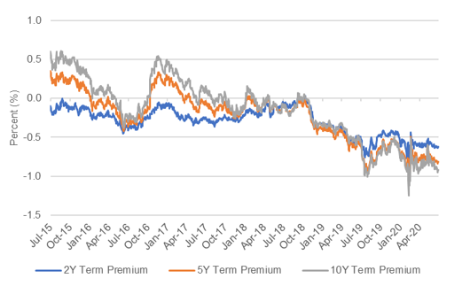 The challenge to generating returns from longer duration is that the benchmark Treasury curve is rich. After stripping out the likely path of fed funds and the expected erosion of buying power from inflation, Treasuries have negative yields. And the longer the maturity, the more negative the yield. The term premium on 2-year Treasury debt is -62 bp, on 5-year it is -82 bp and on 10-year it is -92 bp (Exhibit 5). Bank investors need to demand steadily wider at longer maturities spread to overcome the negative term premium along the Treasury curve.