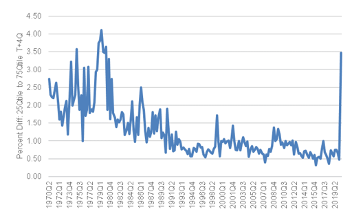 Note: data shows difference between the 25 percentile and 75 percentile in projections of real GDP four quarters ahead. Source: Philadelphia Fed Survey of Professional Forecasters, Amherst Pierpont Securities