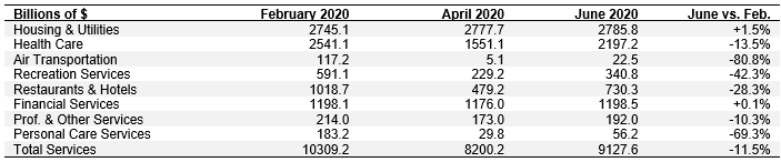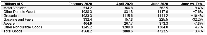 The notable exception was gasoline consumption, not a surprise given both lower prices at the pump and less driving. This category will likely continue to rebound in the summer. Apparel was also down modestly in June from February, perhaps a reflection of the work from home phenomenon.