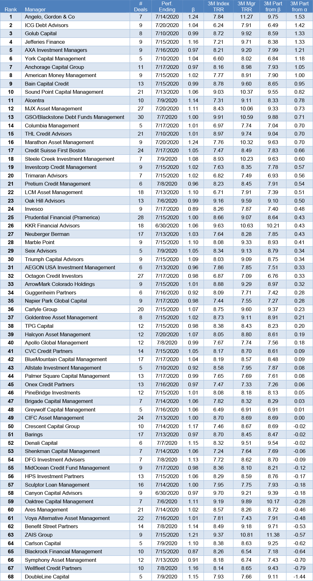 The following managers delivered positive alpha in the market between May and July (Exhibit 4). Angelo, ICG, and Golub top the chart this time. The other alpha leaders include Anchorage, American Money, Sound Point, THL, GSO, and Marathon.