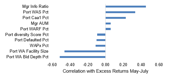 The bid depth and weighted average spread of the portfolios and the manager track record of consistently delivering alpha correlated most strongly with recent excess returns (Exhibit 3). Managers who held loans that are less liquid or have higher spread delivered more excess returns. Additionally, higher exposure to ‘Caa1’ correlated with more recent excess returns. These relationships indicate that managers holding riskier or less liquid loans tended to outperform between May and July.