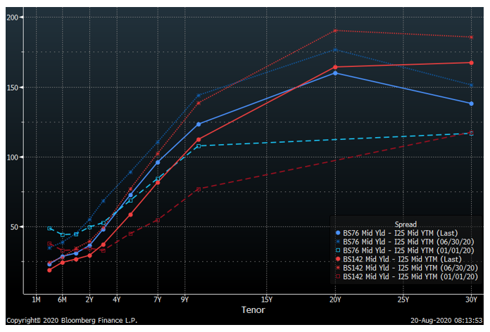 Insurance paper has performed well lately as investors have looked to longer durations for higher yields. Since the beginning of June, insurance has delivered a Top 5 performance by sector with an excess return of 4.67% and total return of +5.15%. This compares to excess return versus 3.63% and 4.01%, respectively, for the broad IG Index. With investors targeting longer insurance paper, it seems reasonable the 10s/30s curves would compress relative to the broader market. But that is not the case (Exhibit 1).