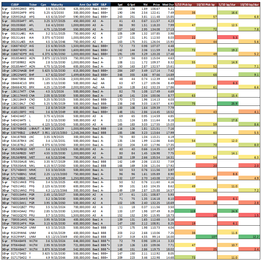 - Surprisingly, some of the best opportunities to extend from the 10-year to the 30-year issues include some of the higher quality issuers in the segment. Included among them are Berkshire Hathaway (BRK: Aa2/AA) and Aflac (AFL: A3/A-), with +61 and +72 bp picks respectively. In recent sessions, BRK and TRV (not in the study) have been trading weaker to the overall segment, and we believe there is an opportunity to add or extend exposure in those names. Compare BRK and AFL versus fellow low-risk issuer Progressive (PGR: A2/A) curve, with one of the flattest curves in the entire study.