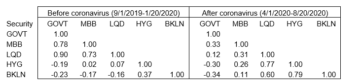 The correlation of daily asset prices has changed significantly since March, at least compared to markets before coronavirus. In the period between early September last year and mid-January, day-to-day changes in the value of government debt, agency MBS and investment grade corporate debt all had correlations between 0.73 and 0.90 (Exhibit 1). High yield debt and leveraged loans generally had small negative correlations with higher quality assets and a modest 0.37 correlation with each other. Correlations at roughly these levels have held since at least the start of 2018.