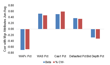 The weighted average price and bid depth of the portfolio correlated most strongly with recent excess returns (Exhibit 3). Managers who held loans that are priced lower or less liquid delivered higher returns. Additionally, higher exposure to ‘Caa1’ correlated with more recent excess returns. These relationships indicate that managers holding riskier or less liquid loans tended to outperform between June and August.