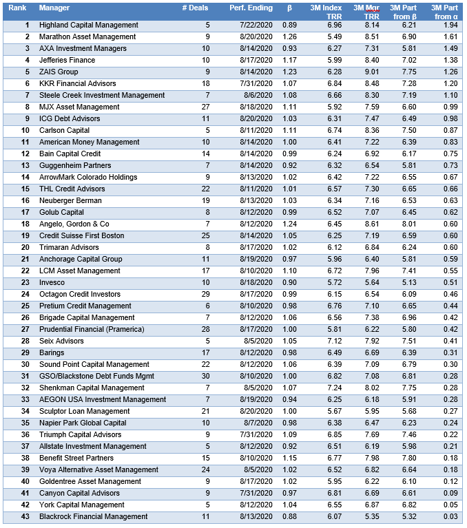 The following managers delivered positive alpha in the market between June and August (Exhibit 5). Highland Capital, Marathon, and AXA Investment top the chart this time. The other alpha leaders include ZAIS Group, Steele Creek, American Money, Golub, and Anchorage.