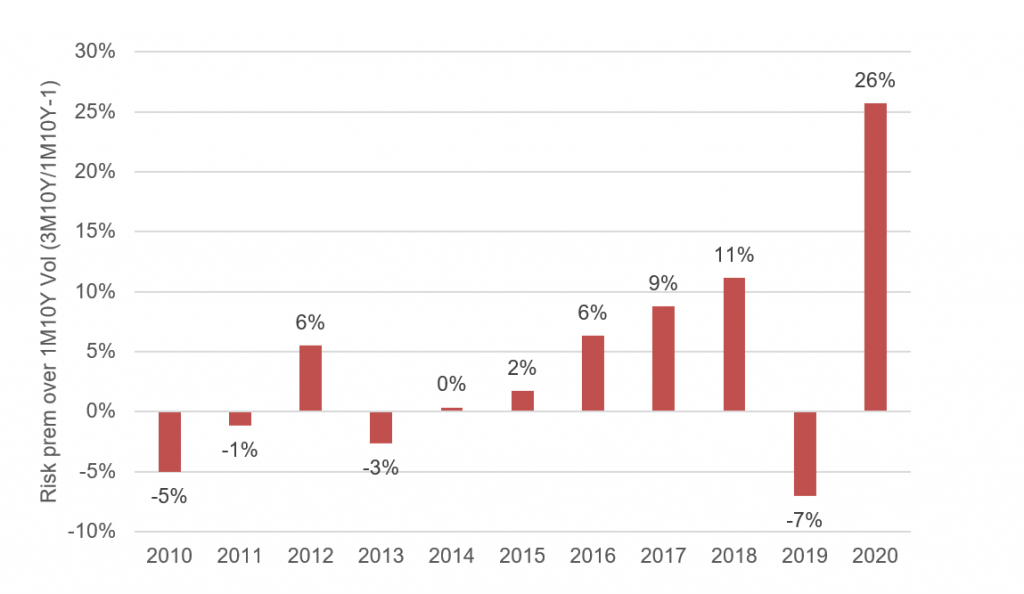 Note: The ratio of 3M10Y swaption volatility to 1M10Y swaption volatility. Chart shows percentage deviation from 1.0. Annualized normal implied volatility on 9/15/2020. Option prices reflect all events that occur before expiration including elections, Fed meetings, economic announcements, and other influences.