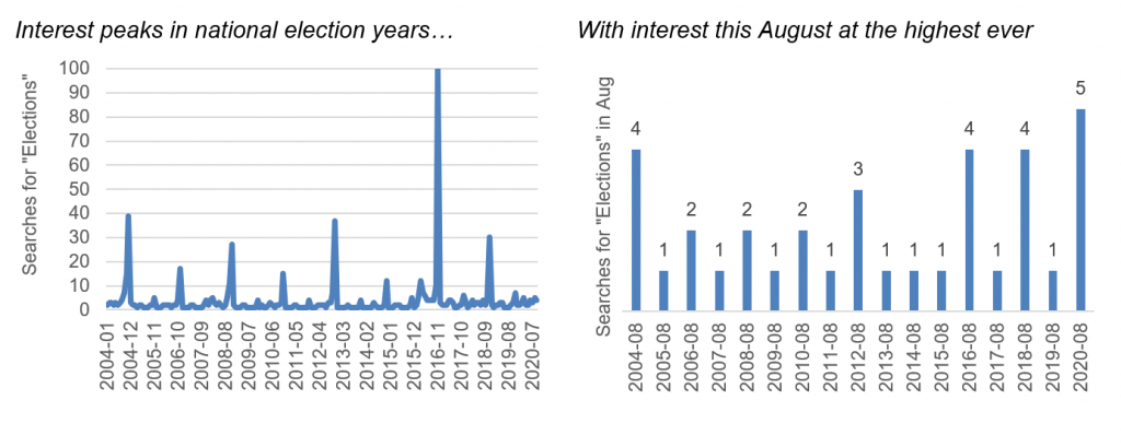 The broader public also has its eye on this race more closely than any other recent national race. Google Trend data on searches for “election” shows a peak in interest in November of each presidential and mid-term election year this century, with interest in November 2016 running at least two and a half times the rate of any earlier election (Exhibit 2). The peak in 2020 is likely to set a record. As of August, interest already stood well above levels for any prior presidential or mid-term year.