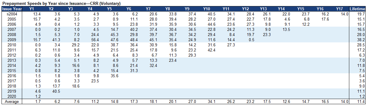 Lifetime voluntary prepayment speeds (CRR) across vintages with at least 10 years of maturity range from 15 CRR to 38 CRR (Exhibit 8). On a month to month basis these speeds vary considerably, and current 12-month speeds across vintages range from 10% CRR to 32% CRR. The highest speeds are in the 2010 to 2015 vintages, although the 2018 vintage has a 12-month CRR of 18.3% and the 2019 vintage, where the average prepayment penalty is still 8 to 9 points, is currently prepaying at 13% CPR.