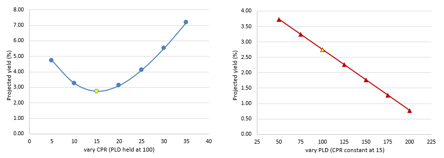 Prepayment speeds are never constant, of course, but an increase (or decrease) in speeds over the short term will raise projected yields even if speeds later fall back to “normal”. Higher defaults will certainly lower performance, as going from 100 PLD to 150 PLD will drop the projected yield from 2.75% to 1.75% at 15 CPR.