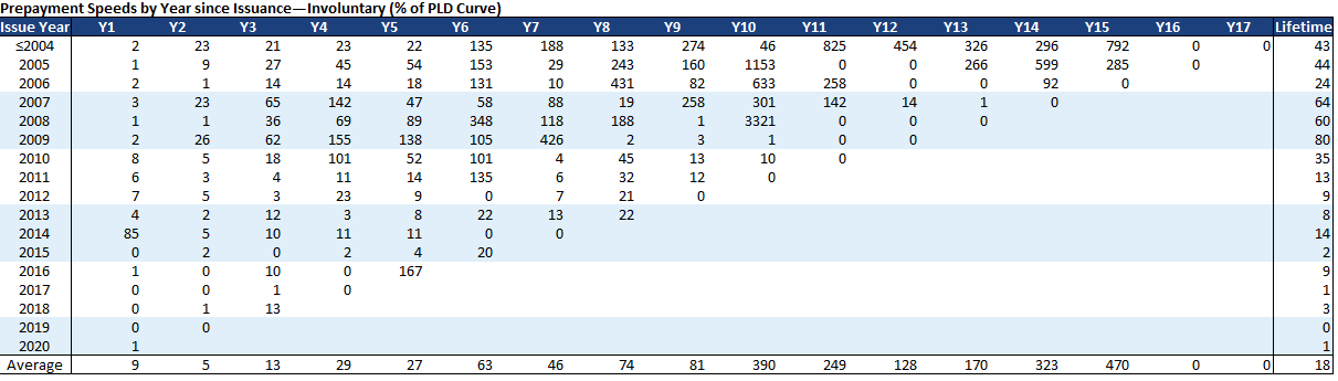 Using 50% PLD is a good approximation over the lifetime of a project loan security based on historical involuntary prepayments, though the current crisis and levels of forbearance could arguably support conservatively assuming 100% to 150% PLD for performance projections.