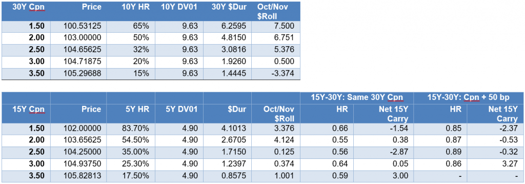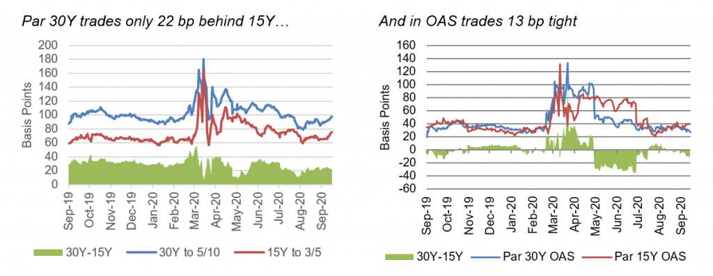 Par 30-year MBS continues to tighten to 15-year MBS, opening the door to trading out of 30-year 2.0% pass-throughs and into 15-year 2.0% pass-throughs with a net gain in carry and convexity.