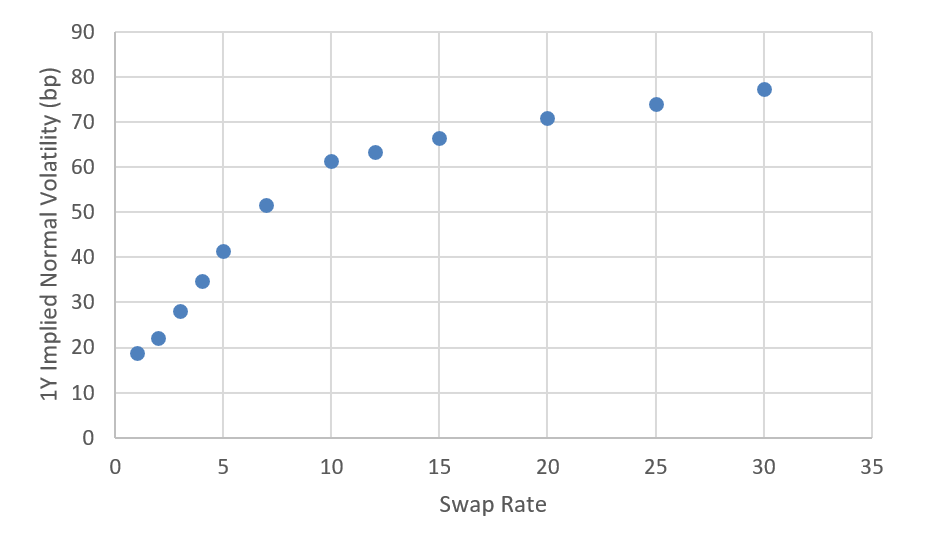 Note: Data show annual volatility in basis points implied by 1-year options on 1-year forward swap rates as of 9/22/20.