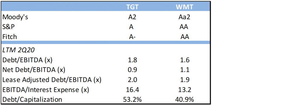 Management has largely maintained a very strong balance sheet and has been targeting high coupon debt for quite some time to improve interest costs and coverage metrics. A majority of the bonds in the tender offer have been tendered for in the past, as early as 2013. TGT’s EBITDA/interest coverage at the end of 2Q20 stood at 16.4x, over three turns better than higher rated peer Walmart (WMT).