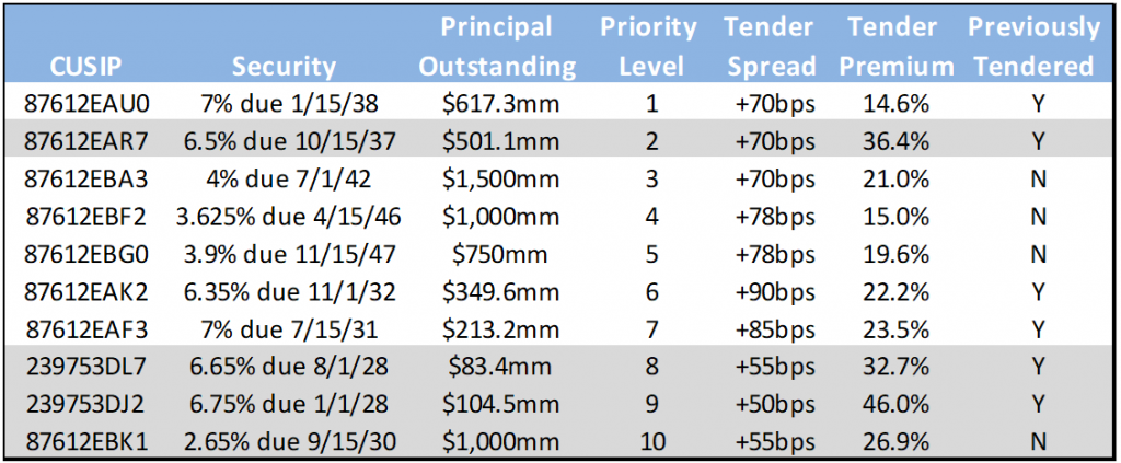 Target Corporation (TGT) announced that it would be tendering for $1.75 billion of debt in a waterfall tender offer. The tender is primarily focusing on high coupon debt throughout the capital structure, a move seen from other high quality single-A credits such as The Coca-Cola Company (KO), given the current low rate environment. Target is using cash on hand to fund the tender, while similarly rated peers have funded their tender offers with newly issued debt. The offer, with an Early Tender Deadline of October 6, 2020, further strengthens an already strong balance sheet, underscoring that TGT is a core hold in the retail sector.